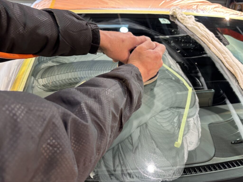 フロントガラス周辺に養生を施し専用のポリッシャー類を使い研磨していきます。今回は傷が深く回数を重ねて研磨していきます。