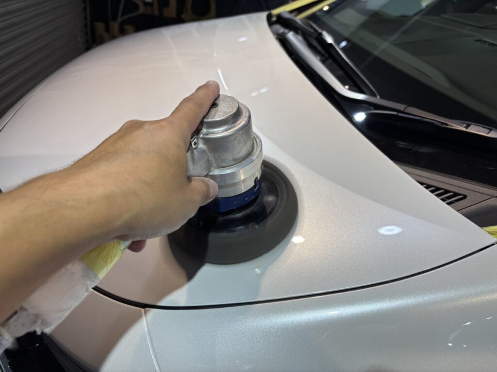 弊社では、新車でも研磨します。何故か?それは、ラインアウトしてからオーナー様に納車される迄の間、必ずしも屋内保管されているとは限らない為隠れた雨染みや油分を除去する為に軽く研磨をします。こうする事で、コーティングの定着不良などを起こさないようにします。研磨後はコンパウンド除去と脱脂を行いコーティング塗布の準備をします。