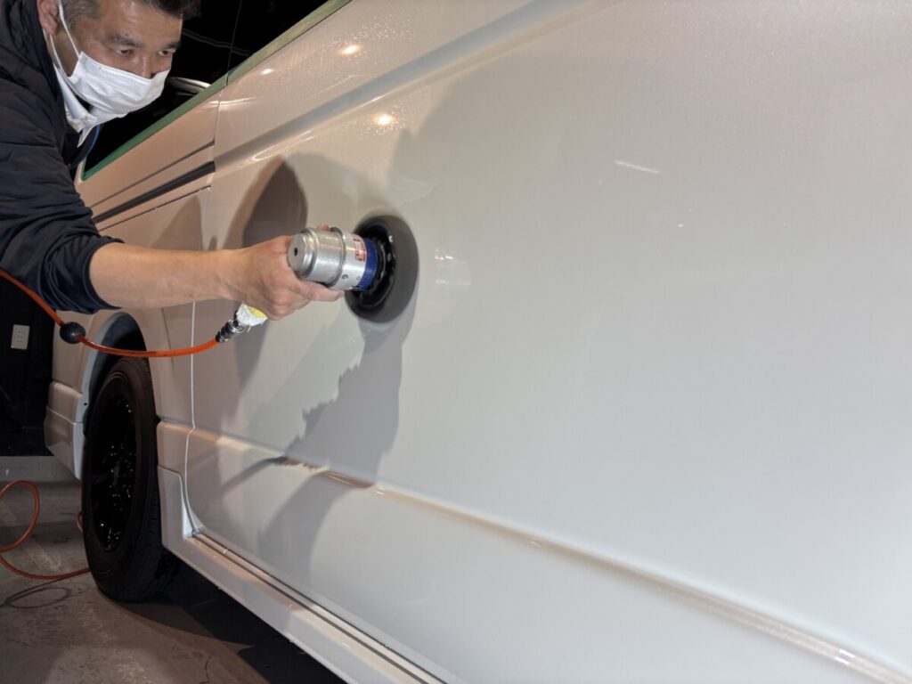 軽研磨が終わり脱脂をおこなってからコーティングを塗布していきます