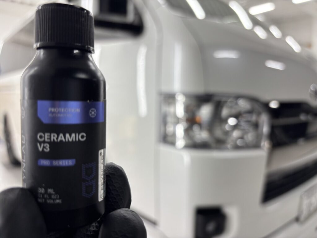 お客様にセラミックVer.3をご提案させて頂きました。ファインラボセラミックコーティングの中で疎水力が強く、ツルツルした手触り、スッキリとしたクリア感になる艶など、コスパに優れたコーティングです。