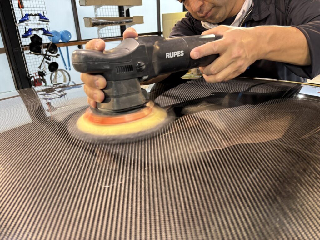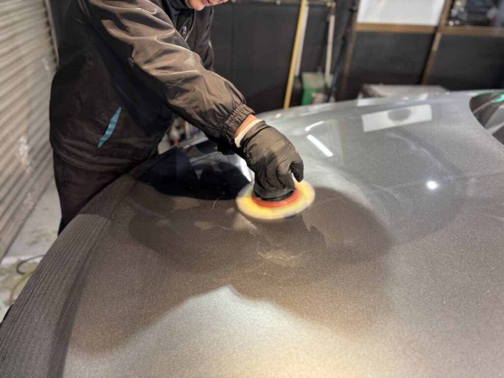 ガラス全面の撥水下処理を行い洗車をしてから研磨作業を行います。今回、弊社にご依頼頂いた経緯を少々。実は弊社ご依頼頂く少し前、お客様が懇意にされている方の紹介で他店様で3年保証のコーティングをされたそうですが、納車時お車を確認したところ施工前とボディーの状態が変わらず雨染みだらけだったとの事。言うに言えず困ってらしたところ弊社にご相談にいらしたそうです。実際ワタクシも確認したところなかなか酷い状態でした。弊社施工時はボディー各部を確認しながら研磨を行いました。研磨後は洗車、脱脂を行いコーティング塗布の準備を進めていきます。