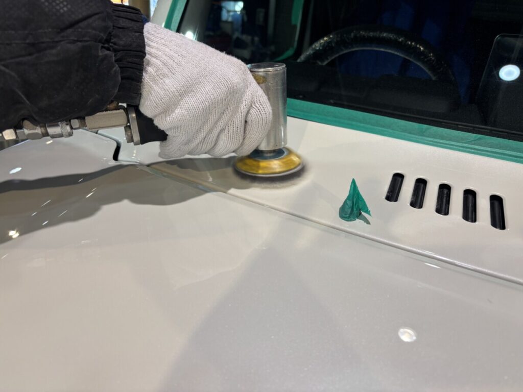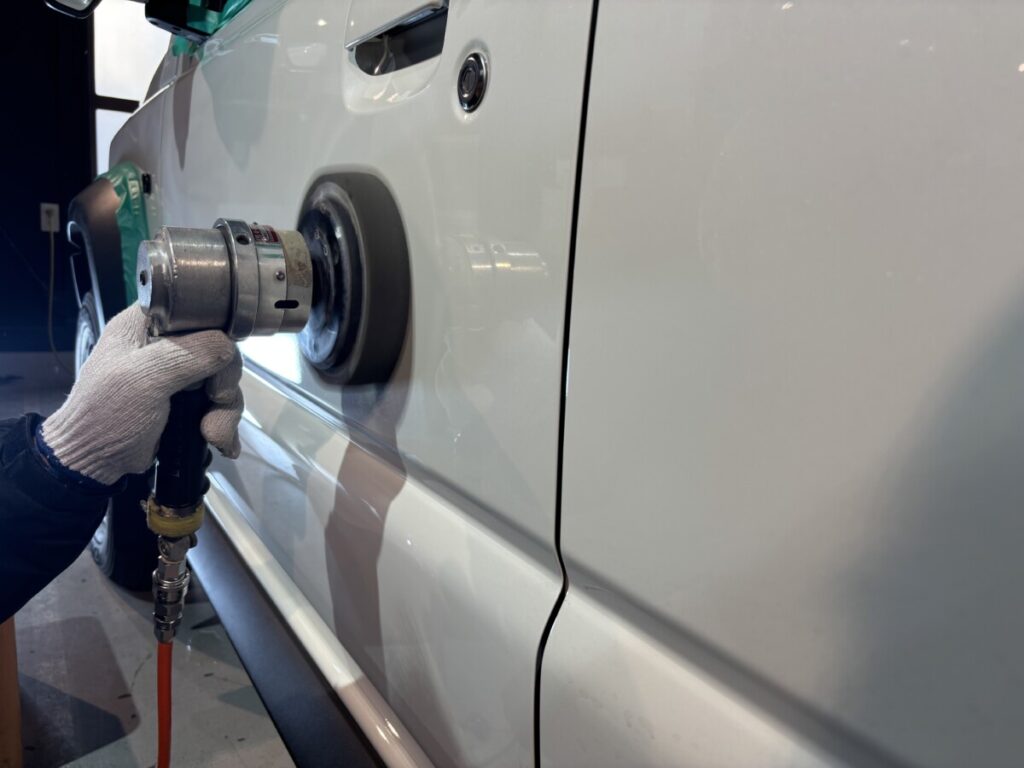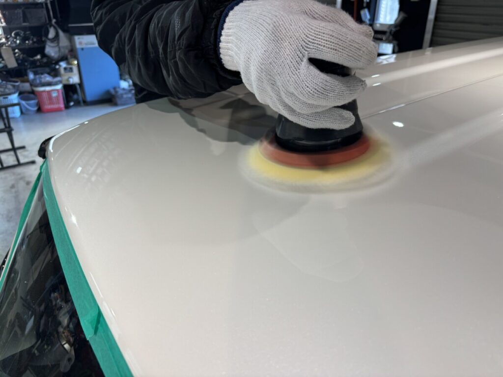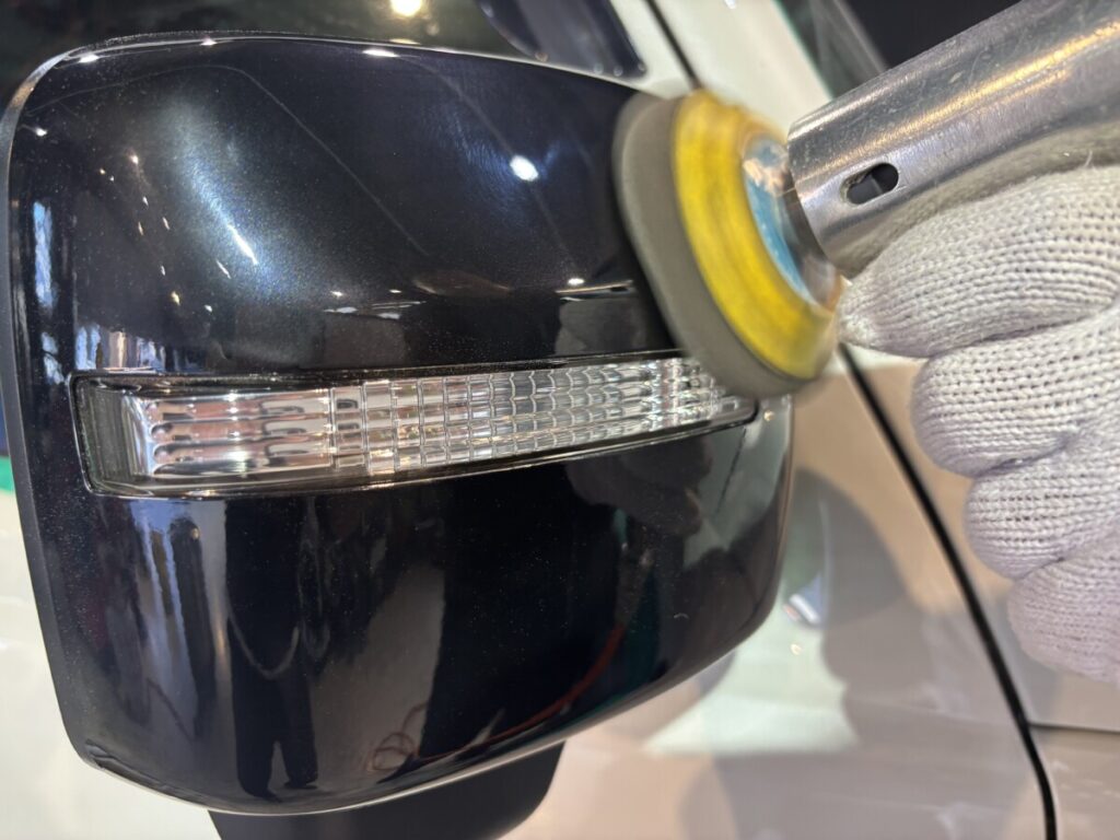 ボディーの状態や形状に応じてポリッシャーやバフを選択し研磨作業を進めていきます。その後、コンパウンドを落とす為に洗車を行いヒールライト塗布の準備を進めていきます。