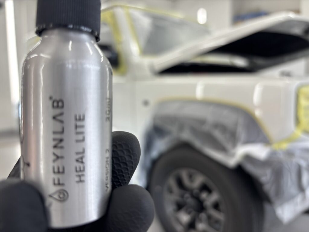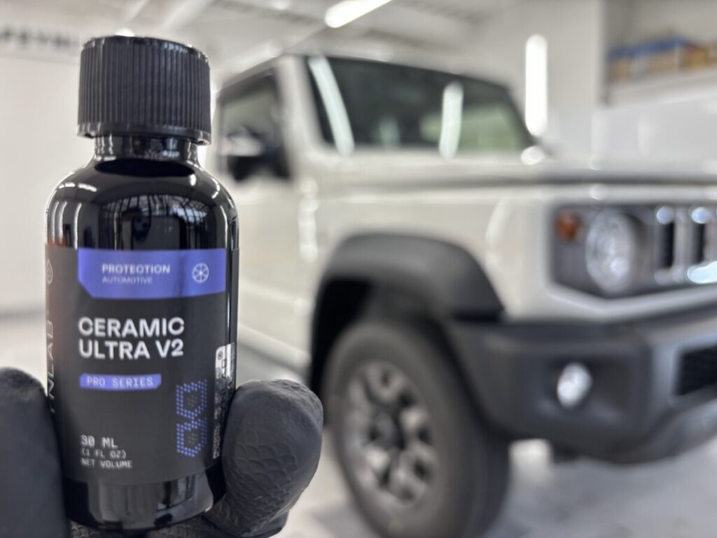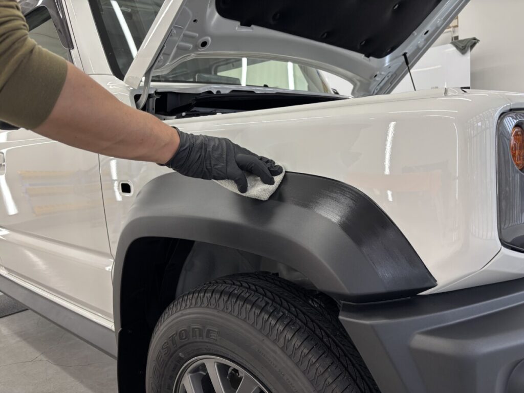 次に未塗装樹脂や灯火類等のコーティングです。ファインラボウルトラVer.2を塗布します。ヒールライトとの違いは自己修復機能があるか無いかでそれ以外の性能は同等です。
