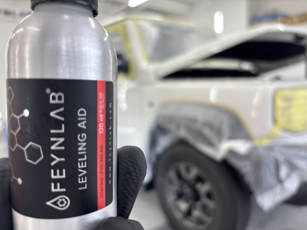 ヒールライトを塗布した後を追いかける様にレベリングエイドを塗布していきます。コーティング面を平滑かつ拭き取りしやすくする為のものです。硬化すると修正が困難な為、ヒールライト塗布、レベリングエイド塗布、拭き取り、チェック。このサイクルを2パネル毎に行っていきます。仕上がりを左右する工程なので、より一層眉間にシワを寄せて作業していきます(笑)。