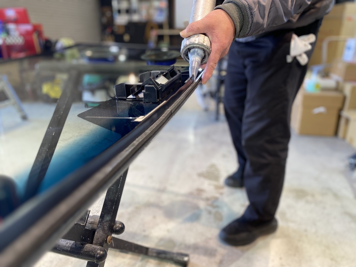ガラス剥離の為に、専用カッターやスクレーパーを使用しガラスをボディーから剥離するのと、ボディーに残ったボンドを剥離して新しいガラスを装着する準備作業を進めます。